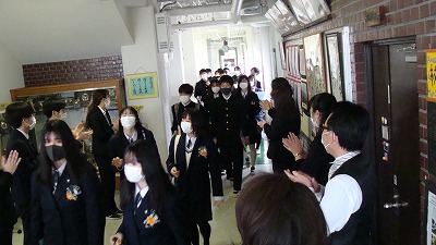 最後の学活後職員全員で花道をつくり、学校を後にする生徒たちを見送りました。