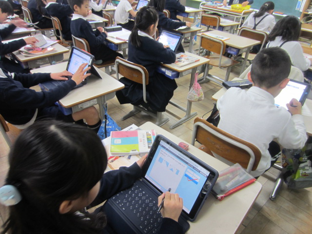 国語科。『大造じいさんとガン』を読みながら、場面をとらえて班で話し合っていました。