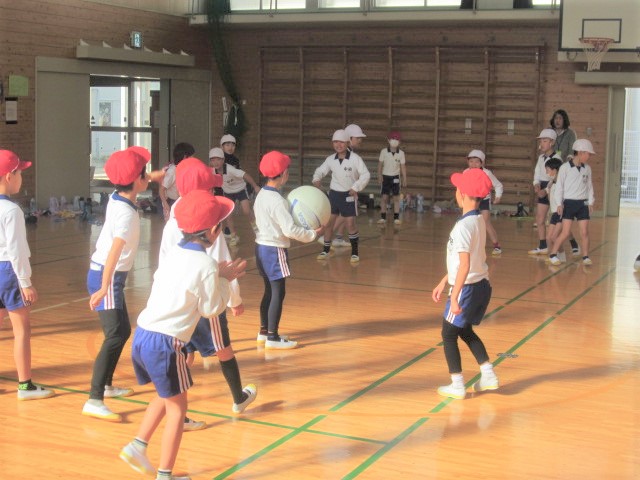 体育館でソフトバレーです。作戦タイムで班ごとに考えました。