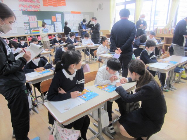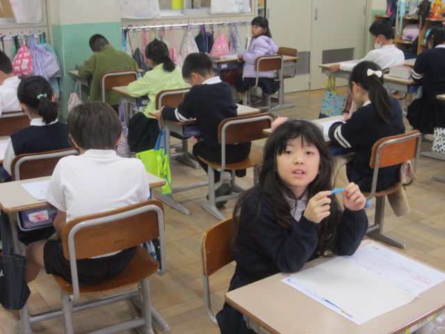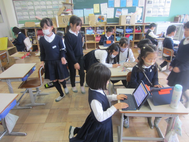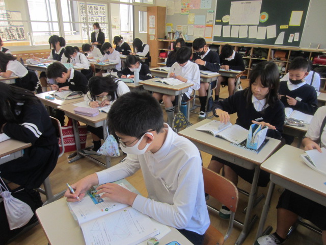 社会科。今と昔の湖岸道路の写真を見比べて話し合いました。