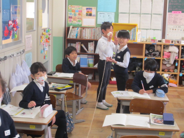 理科。みんなで確認しながら乾電池、豆電球をつなぎました。
