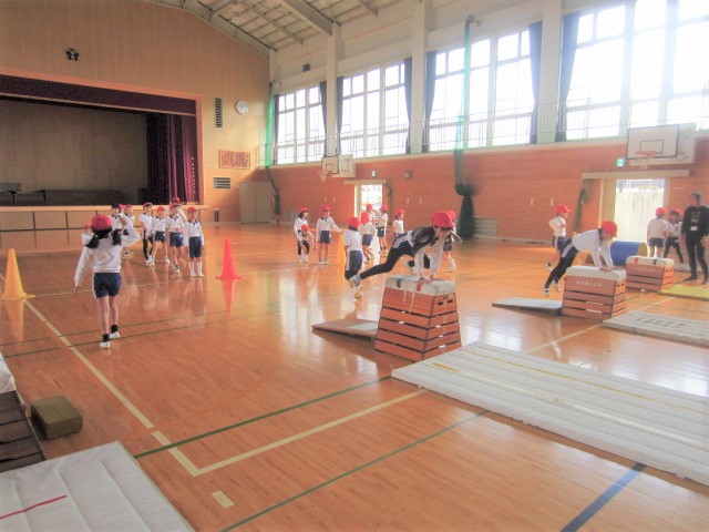 体育館での体育です。大なわとびのあと、短なわとびをしました。