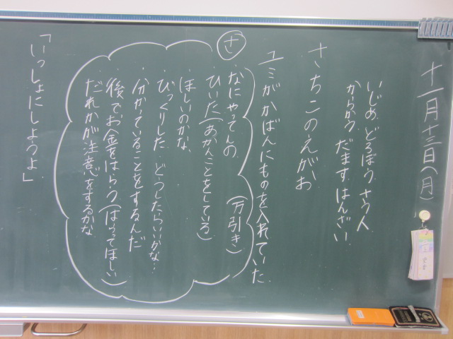道徳。加藤さんのいいところをみんなに話しました。それを聞いたお母さんは「ふふふ」と笑っていました。