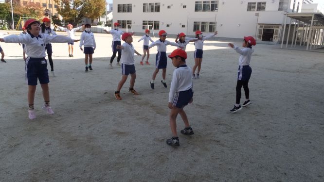 運動場でタグおにのあと、なわとび練習をしました。