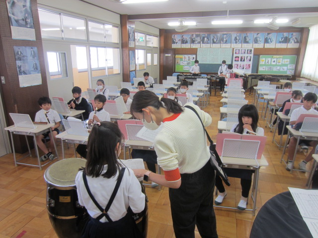 株式会社 近畿ブラザーの橋和田さんと東口さんにご来校いただき、5年生にミシンの使い方を教えていただきました。