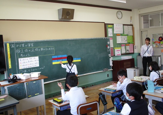 算数科。「3/10」,「3/5」を図に表します。