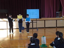 最後に、生徒指導担当から、クイズを交えながら、春休みのくらしについての話を聞きました。事故やけがのない春休みを元気に過ごしてほしいと思います。