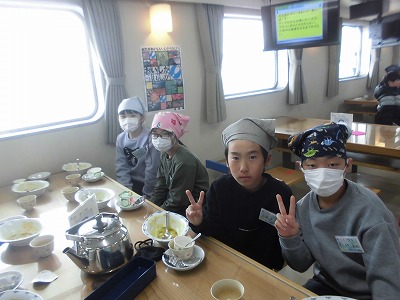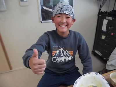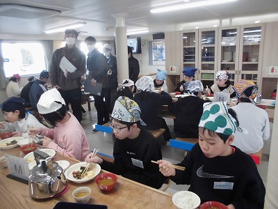 うみのこでの最後の昼食は、待ちにまったうみのこカレーでした。たくさんの人がおかわりをして、お腹いっぱい食べていました。おかわりの際には、厨房の方にお願いします、ありがとうございますと言える人が昨日よりもたくさん増えており、こういった面でもフローティングスクールの成果を感じました。田上小学校の子たちともとても仲良くなり、楽しい食事の時間でした。