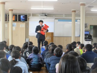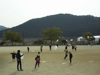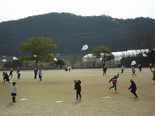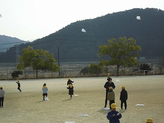広い運動場を使って、思いきり凧あげを楽しんでいます。お正月と言えば・・・の遊びですが、最近ではあまり見かけなくなりました。今日は、朝の寒さも和らぎ、適度に風のある中で、まさに凧あげ日和でした。幼稚園や保育園でされている内容と同じかもしれませんが、「まわりを見てルートを判断する」など、「上手に凧をあげる」だけではない学習になっていました。