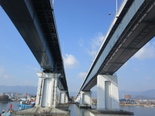 クライマックスは琵琶湖大橋の通り抜け。日頃は橋の上を通行しますが、今日は橋の下をくぐります。ぶつからないか不安そうな声が、くぐる瞬間は歓声に変わりました。