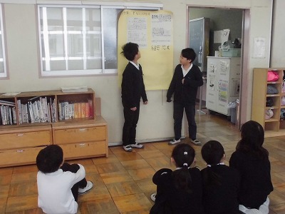 もう少しで学年が1つ上がり、クラスの友達とも離れてしまうことから、おわかれ会を計画しているクラスもあります。提案理由を確認し、話し合いを進めていました。