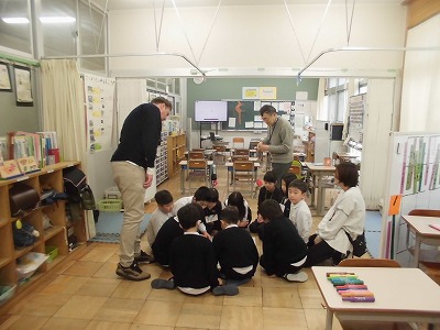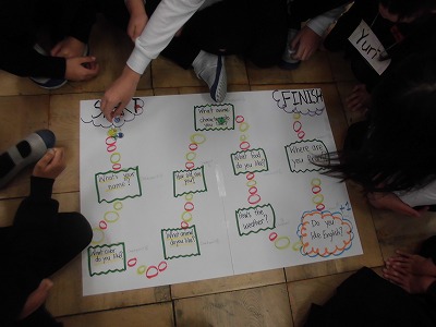 クリス先生と一緒にすごろく形式で外国語に親しみました。すごろくで止まった場所によっては外国語で質問したり、質問に答えたりして恥ずかしがりながらも盛り上がりました。