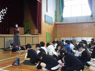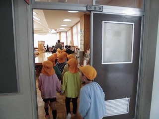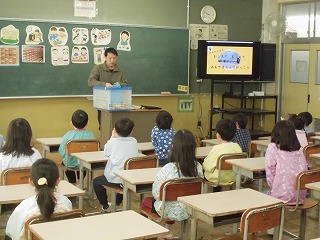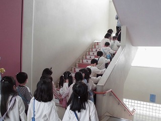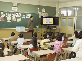 次年度入学の学区内の保育園児が、小学校に授業体験に来ました。以前は出前授業として各園に伺っていたのですが、小学校の雰囲気を味わってもらえるようにと、昨年度から小学校で体験しています。お話を聞いた後、各学年の授業の様子を見てまわりました。