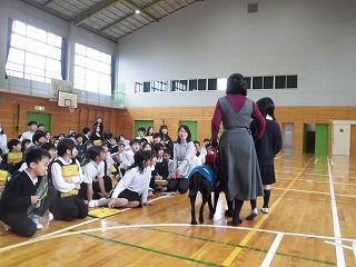 5.6時間目、盲導犬ユーザーの前田さんと盲導犬のペリーに来ていただき、貴重なお話を伺いました。一言も漏らさないぐらい、びっしりとメモを取っている子がほとんどでした。前田さんから困っていることや工夫していることを聞き、「自分から、何かお手伝いしましょうか、と声をかけたい」など自分たちにもできることがあることに気づきました。また、今日伺ったことをお家の方や大人の人にも伝えていくことで、みんながくらしやすいまちにしていきたいという思いを持ちました。