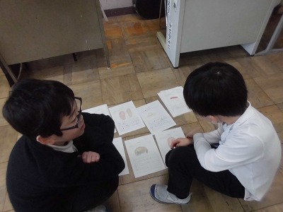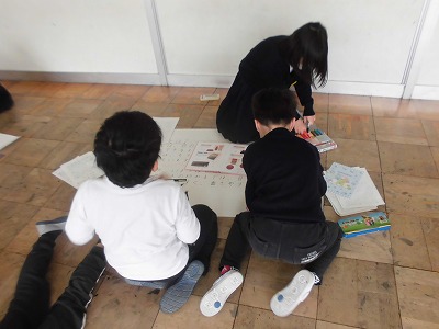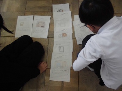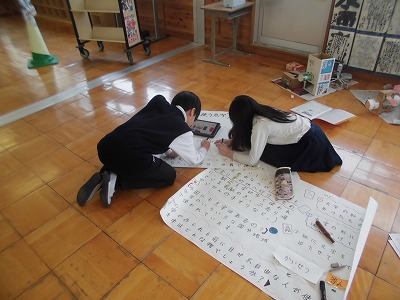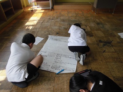 目の不自由な人々について、調べたことを発表に向けてまとめています。発表までもう少し、調べたことが相手に伝わるように字の大きさだけでなく、絵や説明なども入れながら模造紙に書いていました。