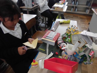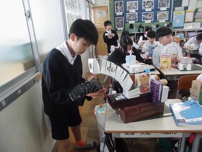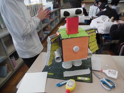 持ってきたお菓子の箱を切ったり、折り曲げたりして、組み合わせて作品を作りました。遊園地や家、ロボットなどアイディア溢れる作品が出来上がってきていました。