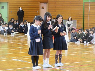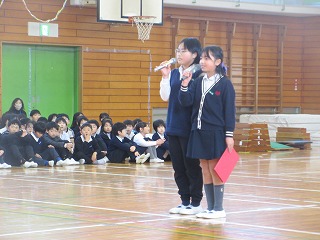5年生が中心になって企画し、6年生を送る会が行われました。司会やあいさつ、花のアーチなどだけでなく、全校で楽しい時間を過ごそうとする雰囲気を5年生全員がつくろうとしているのが伝わってきました。6年生から最高学年としてのバトンを引き継ぐ機会になりました。