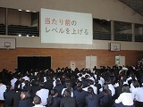 明けましておめでとうございます。 令和8年(2026年)が始まりました。昨日から3年生は実力テストを頑張っていますが、今日が全校そろっての始業式でした。3学年そろって集まる式は、今年度最後です。心を込めて校歌を歌って始まりました。 校長先生からは、まず、今年の干支「丙午」について紹介がありました。様々な言い伝えが多い丙午ですが、どちらも「火」を象徴するもので、躍動の年や激動の年と言われる年です。目標や夢をもって頑張っていこうというお話でした。そして、目標や夢をロープをピンと引っ張ることになぞらえて、いきなり大きな夢や目標をもつ(二人だけでロープをピンと張る)のは大変ですが、途中に目安となる小さな夢や目標をもつ(何人もでロープを持ってピンと張る)と最終的な大きな夢に向かいやすくなるし確実にできるというお話がありました。うなずきながら聞く生徒が多くありました。 生徒会からは、今学期にいじめ防止の授業に取り組むことに触れ、人や仲間を大切にしてより良い学校を目指していこうという話がありました。 生徒指導からは、元サッカー日本代表監督の岡田さんのエピソードが紹介されました。コートを一周走るメニューでコートの内側を走るようになっていたところをきちんとコートの外を走るようにされたことでチームが変わったそうです。同じように、「当たり前」にしていることのレベルを上げて、自分たちで紀律ある学校生活を送ろうというお話でした。 短い3学期ですが、全員で力を合わせていきましょう! |