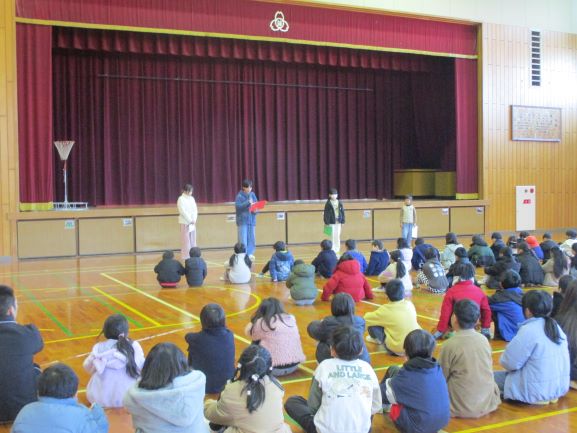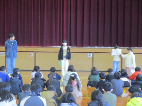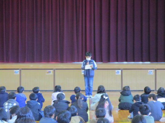 児童会の子どもたちの進行のもと、低中高それぞれの代表の子どもたちが2学期の振り返りの作文を発表しました。児童会の子どもたち・代表の子どもたち誰もが立派な姿を見せてくれました。