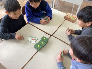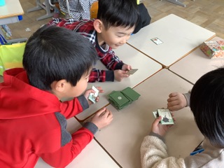 いろいろな昔遊びを学んでいる一年生が、今回は坊主めくりにチャレンジしました。子どもたちは、姫や坊主など絵によって役割が違うことを覚えて、一枚ずつ緊張の面持ちで札をめくっていました。「うわぁー坊主だぁ!」や「やった姫だ!」などの声がたくさん聞こえ、盛り上がりました。