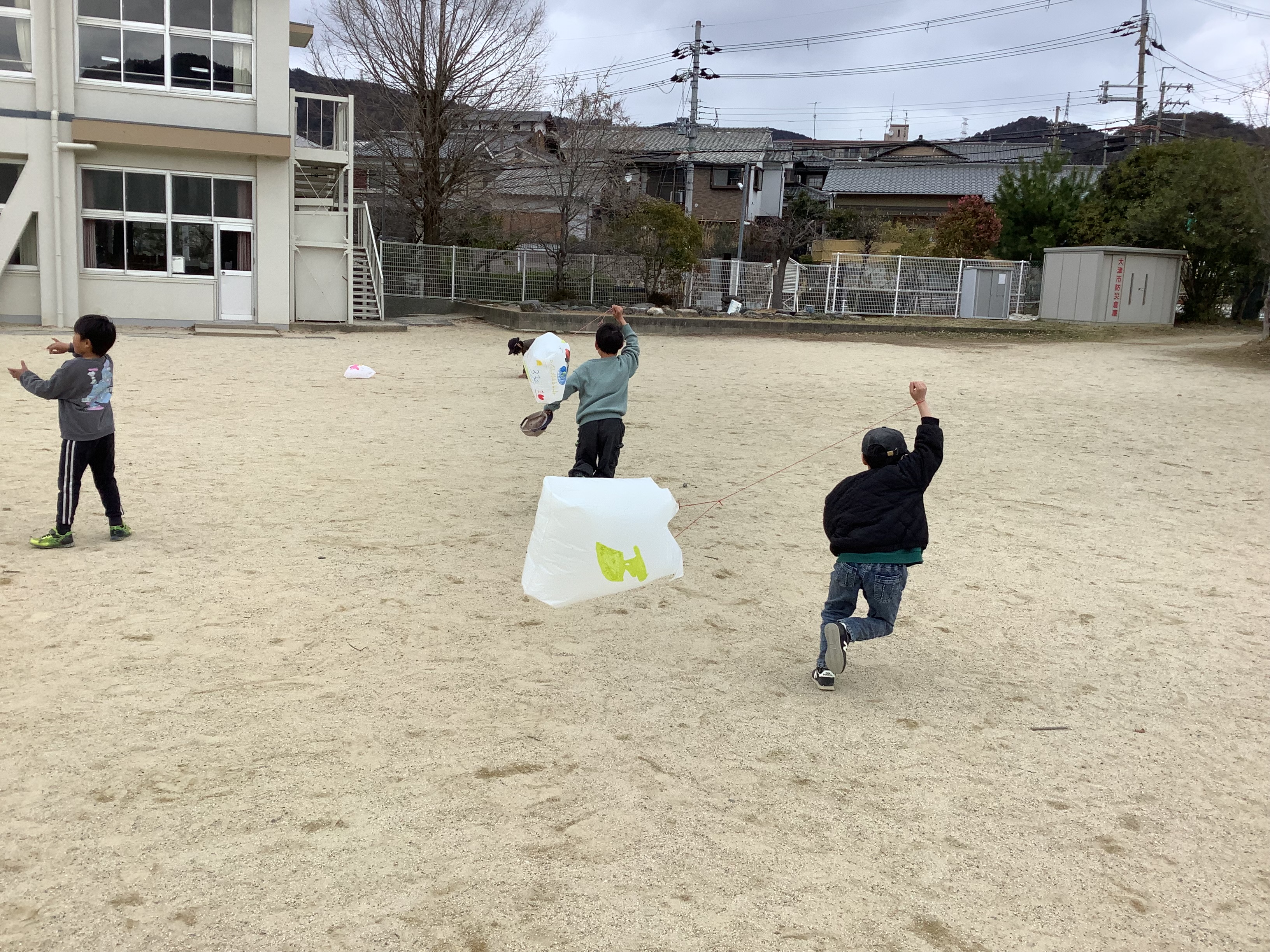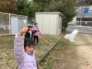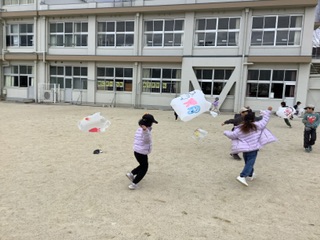 1月に作った凧を、ついにあげることができました!悪天候や学級閉鎖で実施できなかった分、子どもたちは風を意識しながら凧を頑張ってあげていました。たくさん走っている子や立ち止まって風に凧を乗せる子など、様々な姿がありました。「楽しかった!」とたくさんの子が言ってくれました。またお家でもチャレンジしてみてください。