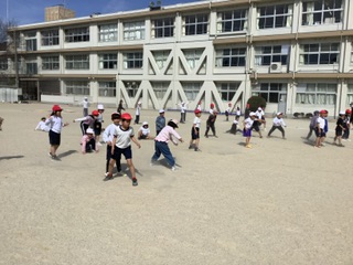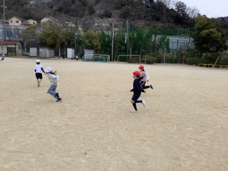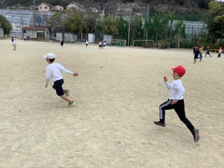 「だるまさんがころんだ」では、運動場の端から端まで使い、ゴールラインまで動きに気をつけながら走りました。チーム低学年で思いっきり楽しむことができました!