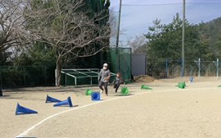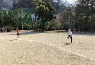 コーンやハードルなどの障害物を飛び越え、ゴールを目指しました。(少し大きい一年生も参加しました)