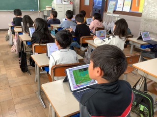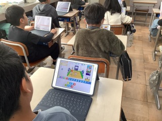 今作っている場面から新しいステージを足して、お話を作りました。次のステージに移動する方法を教えていただき、2つから4つのステージを移動できるお話が完成しました。