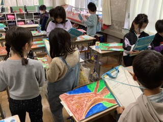 粘土でカラフル小物入れ(立体)と命の木(平面)の作品を鑑賞しました。「たくさんの色でいいかも」など友だちの先品から次の意欲に繋げました。
