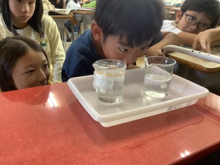 ビーカーに入れた水をラップしているものとしていないもので見比べました。見比べた水の様子を班で「なぜ!?水の量が変わったのか」話し合いました。