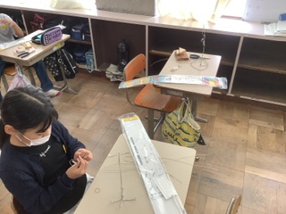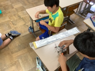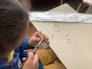 針金を、曲げたり巻いたり重ねたりしながら、ビーズや木片と組み合わせて自分だけの作品を作っています。それぞれの工夫が見られ、完成が楽しみです。