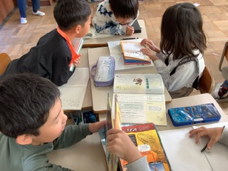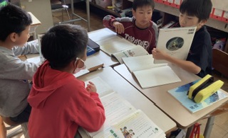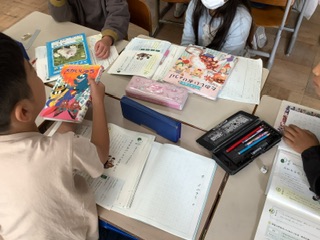 1人1冊ずつおすすめの本を決めて、班の人に紹介したいところをアピールしました。アピールした本の中で1年生にどのような方法で紹介するのか決めました。