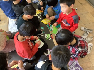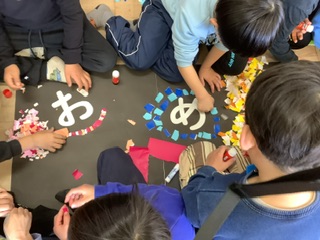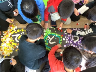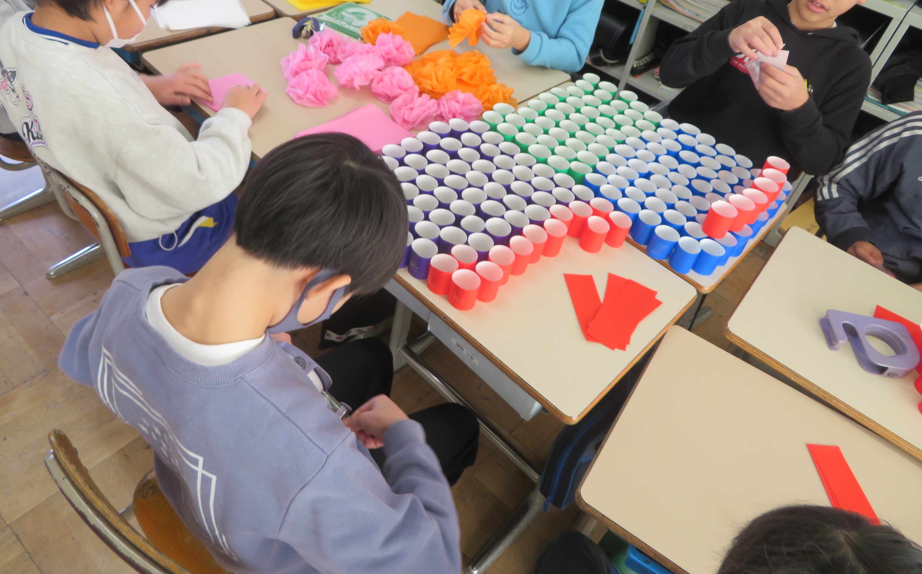 6年生を送る会に向けて、掲示するおめでとうメッセージをみんなで作成しています。デザインのアイデアもみんなで考えました。切って、貼ってと大忙しですが、みんな楽しく取り組んでいます。完成までもう少しです!