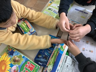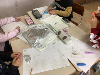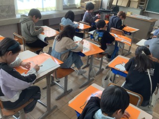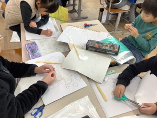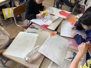 下書きを見ながら、台紙に絵を写し、いろいろな素材を貼り付けています。出来上がりのイメージをしながら、貼り付けるのは、少し難しい様子です。
