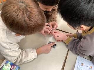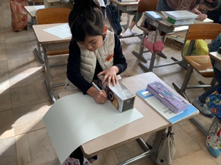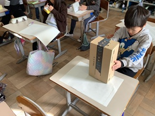家から持ってきた箱の面を、鉛筆を使って正しく写し取りました。箱によって、面の大きさや形が異なることがわかりました。