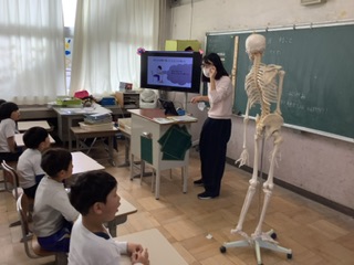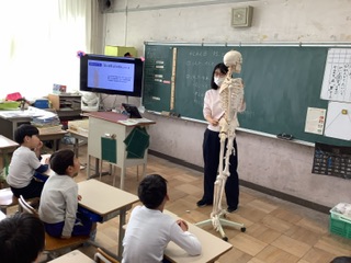 身体測定の前に、保健室の先生から、姿勢についてお話を聞きました。骨格標本(すこし怖いですが)を使いながら、姿勢が悪くなると、