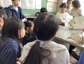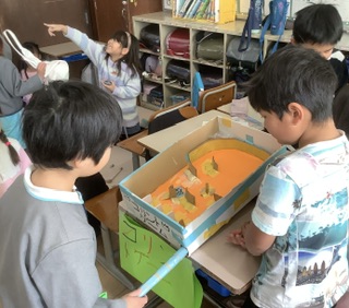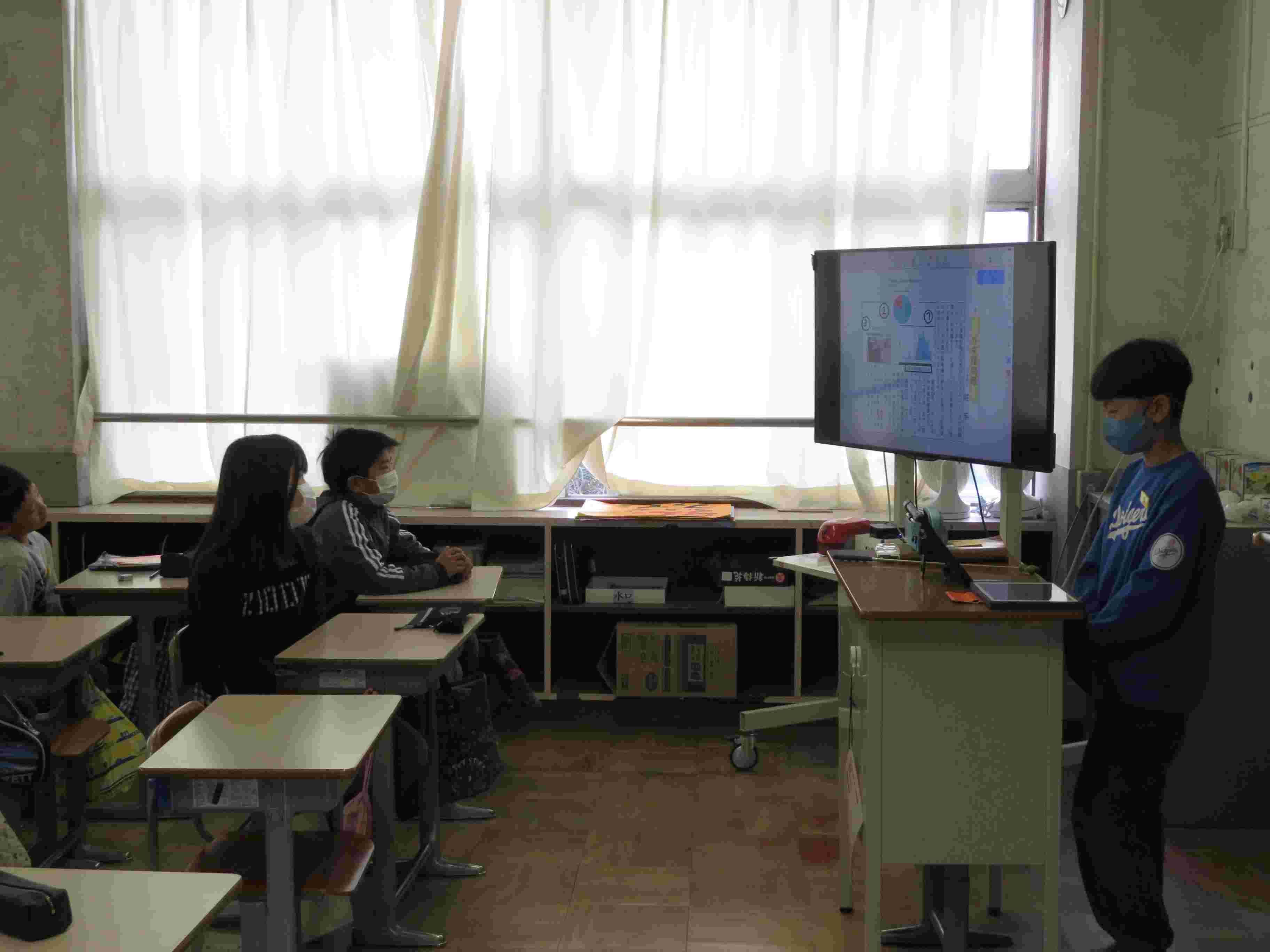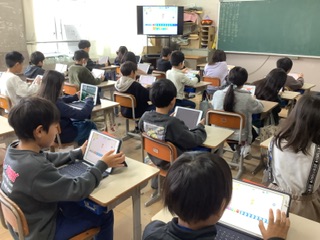 自分の興味のある自然環境の問題について、タブレット等で調べ学習をし、文章にまとめました。その自分のまとめた画面を見せながらみんなに発表をしました。