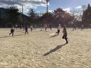 A、Bに分かれてリレーをしました。コーンを回ってバトンを渡します。