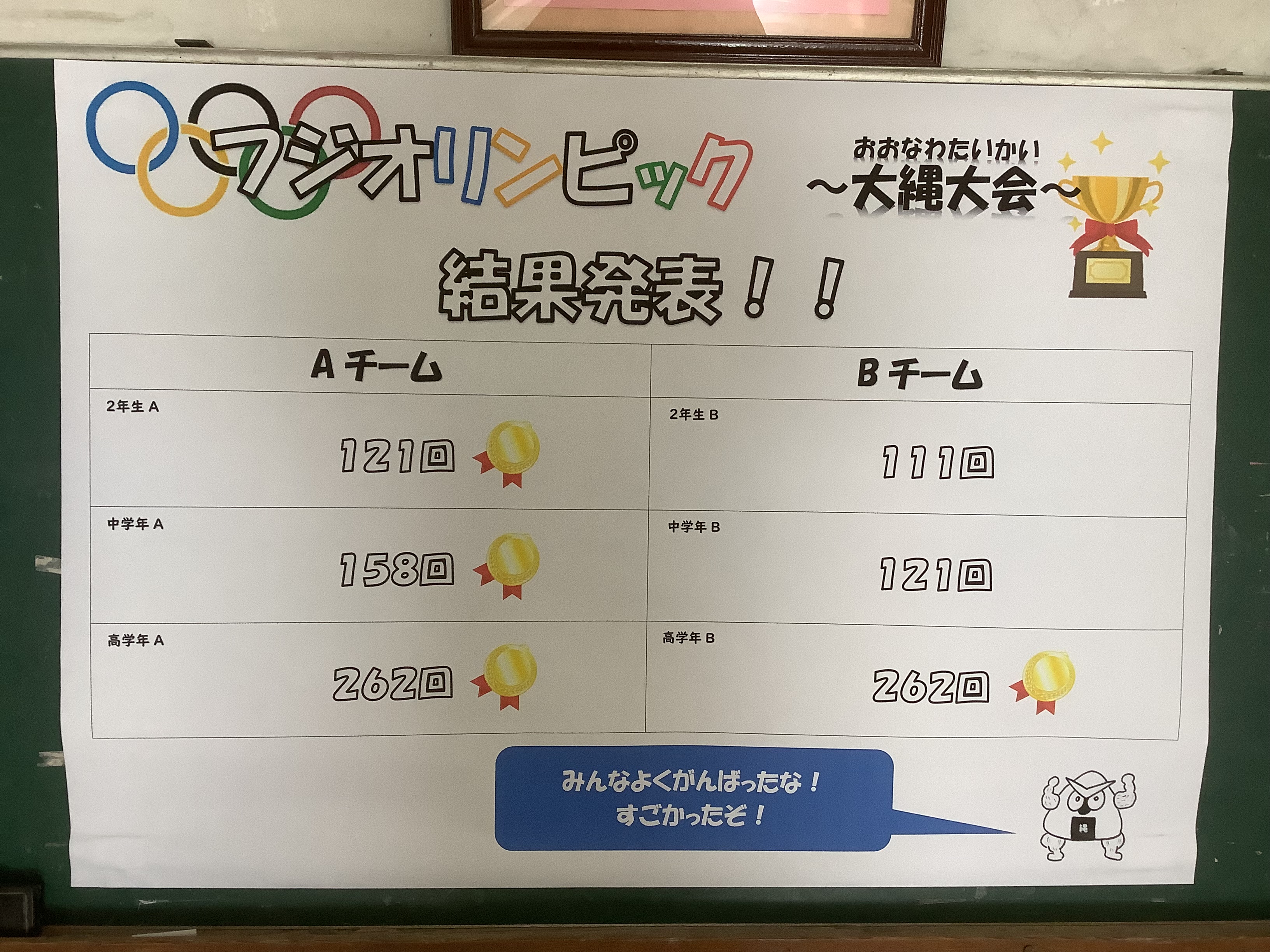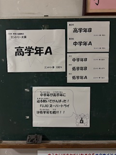 2/10の昼休みに行われた「フジオリンピック 大縄大会」。保護者の応援もあり、大盛況の大会になりました。その結果が、本日の朝、昇降口に貼り出されました。勝ったチームも負けたチームも、みんな本当によく頑張りました。