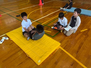 今日は、昼休みにスポーツランキングの鉄棒ぶら下がりの部がありました。4人1チームでどれだけ長く鉄棒にぶら下がれるかを競います。どのチームも、一生懸命頑張ることができました。中には、学年を越えてチームを作っているところもあり、仲良く運動することができています。次は反復横跳びと前とびです。