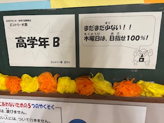 現在は縦割りAチームがリードしています。毎日の宿題(体育)やスポーツランキングなどまだまだ、勝負は分かりません。