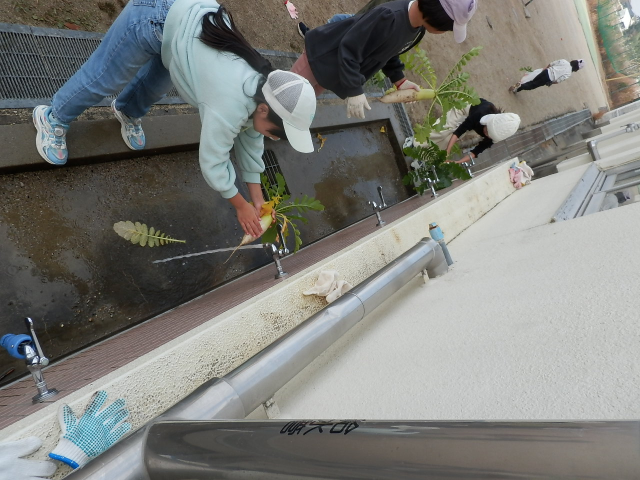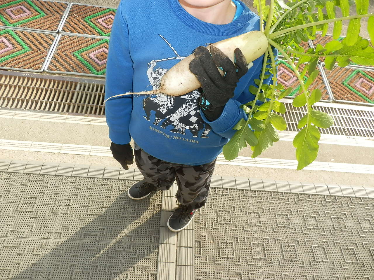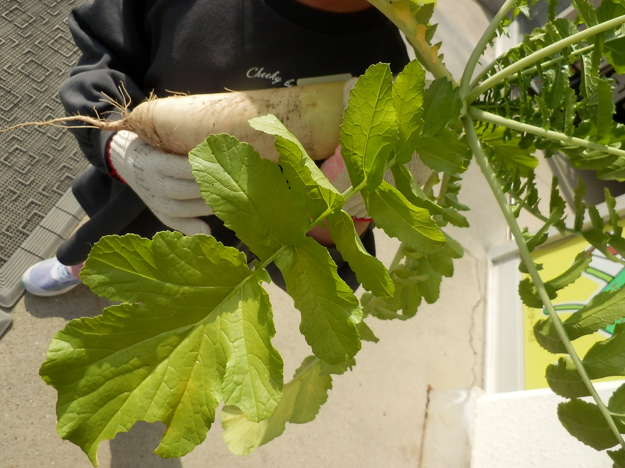 2年生が植木鉢で育てていた大根が立派に育ちました。植木鉢の中でまっすぐ大きく伸びていました。