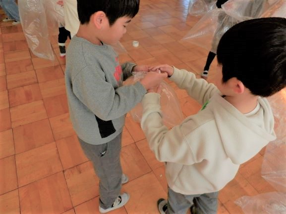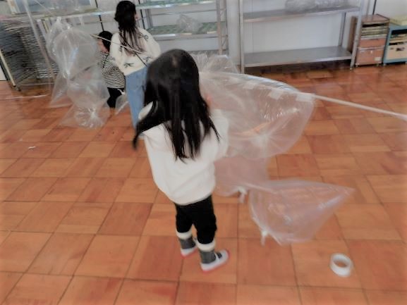 ふくろに空気をためてふくらませ、その袋を積んだり、つないだりして創作します。友だちとイメージを共有しながら、「あーしよう」「こうしよう」の言葉が飛び交い、楽しく学習していました。