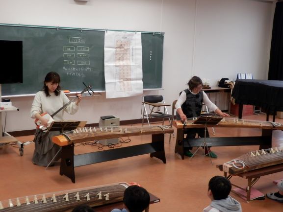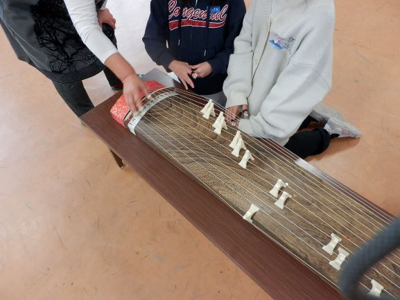 4年生の音楽の学習の一環で、地域の方に来ていただき、お琴の体験をさせていただきました。初めて見る、触る子が多く、とても素敵な体験をさせていただきました。