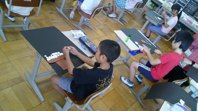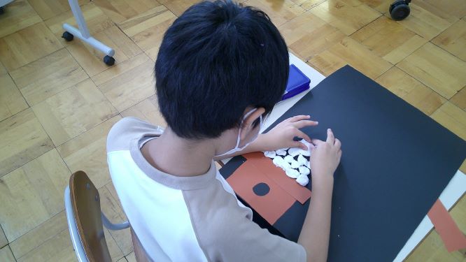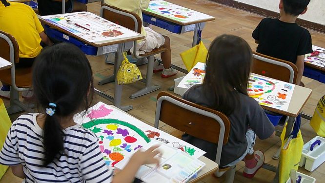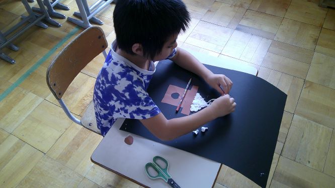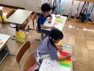 今回は、お話の中で出てきた花火を描くため、クレパスを使って色を塗っていました。