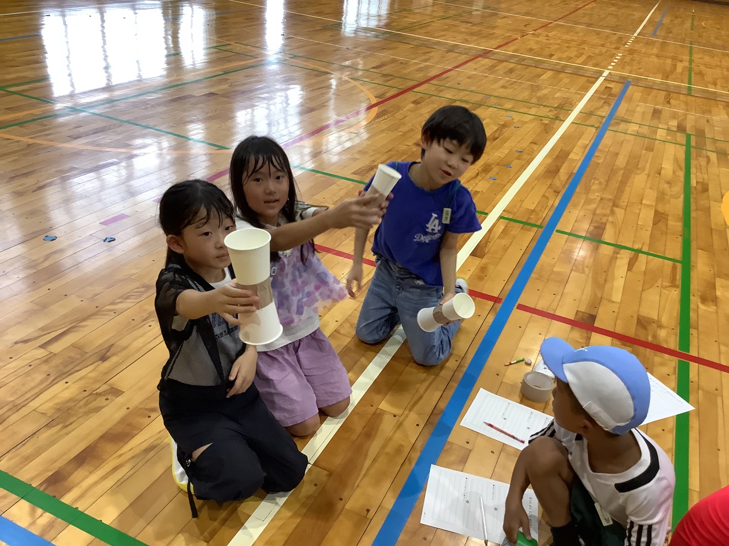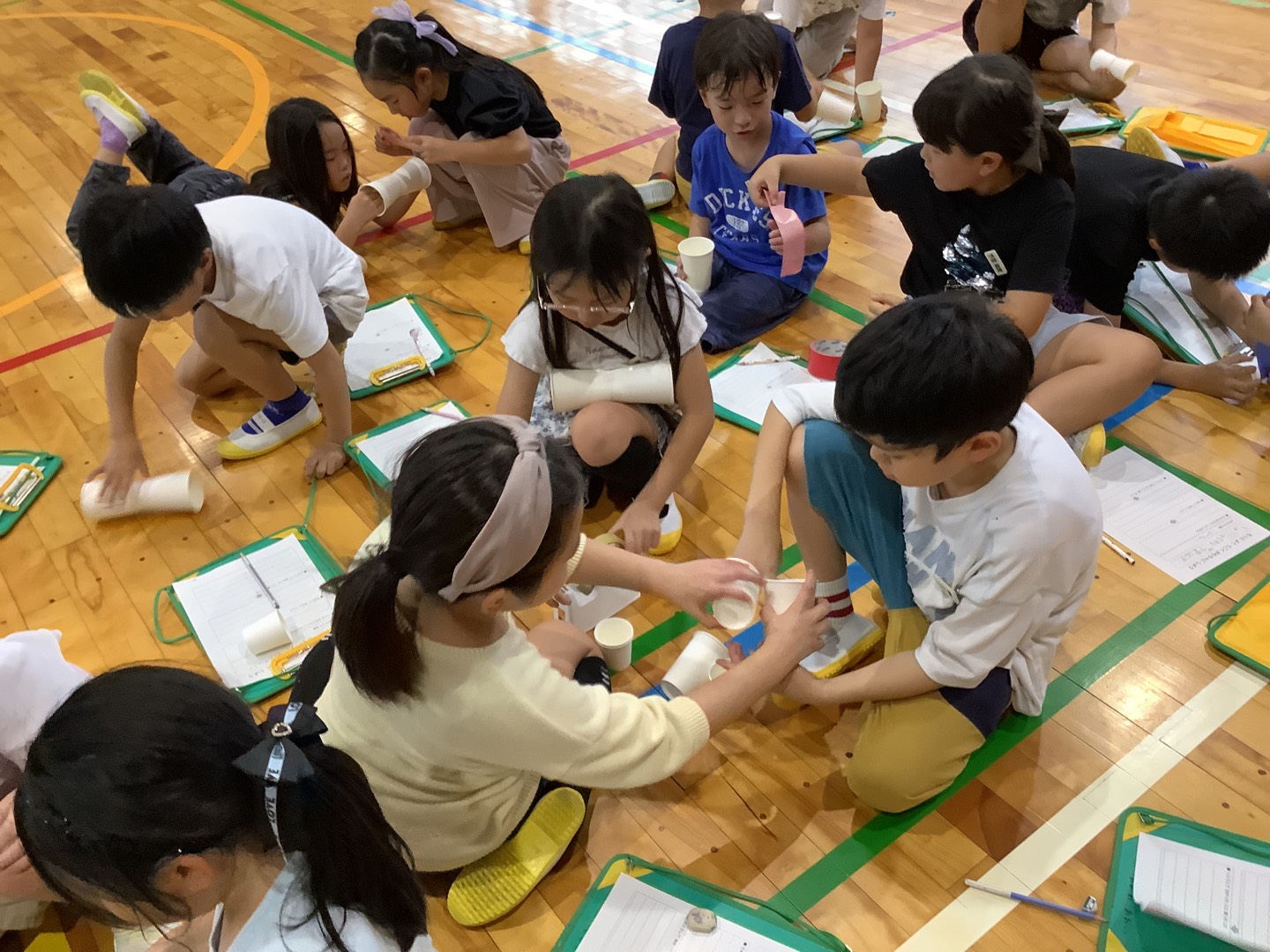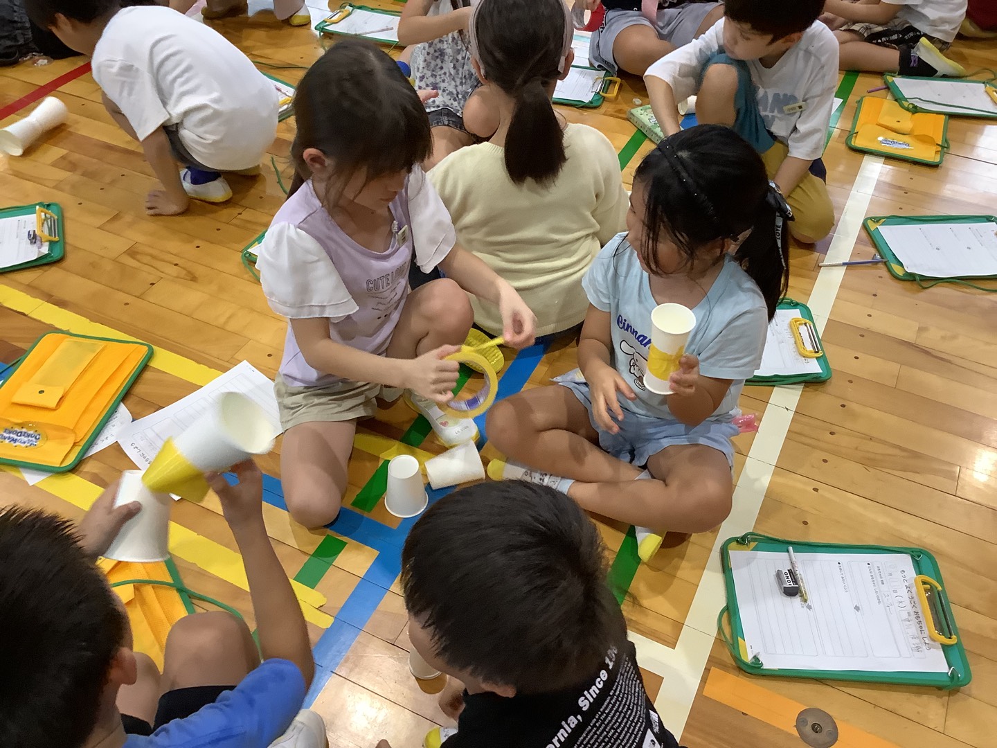 生活科で紙コップUFOを作りました。友だちと協力しながら作る姿や教え合う姿が見られました。また、もっとよく動くおもちゃにするにはどうしたらいいかを考え、材料を工夫して試すことができました。