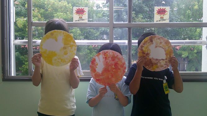 わかばの子どもたちが図工でお月様を描いたと見せに来てくれました。色とりどりのお月様ですが、ウサギがいるのは3人とも同じでした。このあとお団子づくりだと楽しそうに言ってくれ、とても微笑ましかったです。