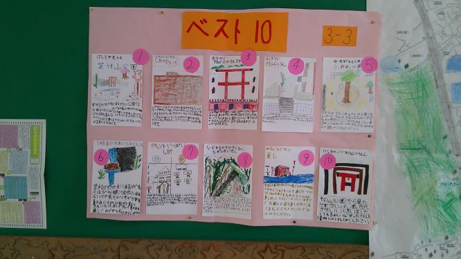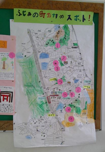 階段横の掲示板に3年生が学習でまとめた「ふじみの町おすすめスポット!」マップがはってありました。横には各スポットのおすすめポイントの解説付きです。