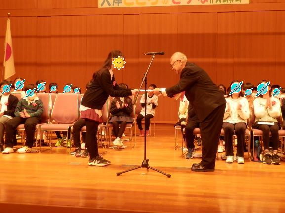 5年生を対象に募集された「こころのきずな作文」コンクールに1650点余りの中から2名の本校児童が入選しました。表彰式にてステージ上でたくさんの人の前で賞状をもらいました。