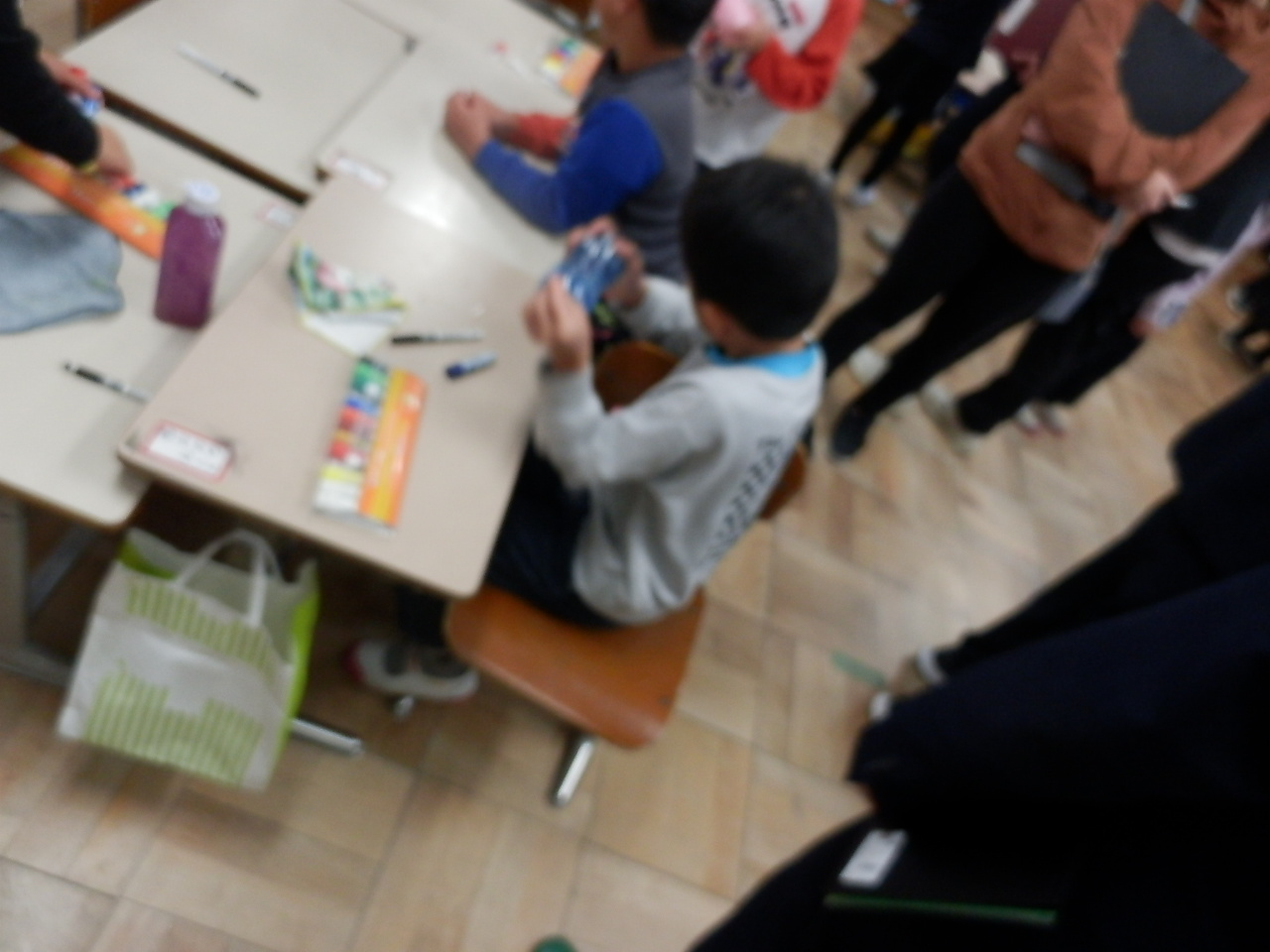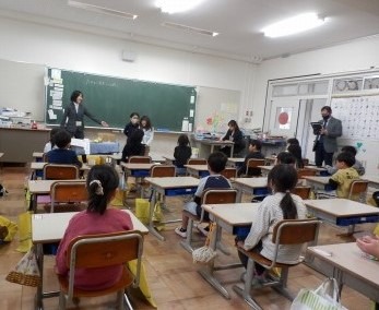 1年生の生活科では、秋の自然物を使ったおもちゃや遊びで秋まつりをしようと準備していました。幼稚園、保育園、こども園の5歳児クラスを招待するため、園児たちが楽しめるようにおもちゃや遊びのルールを工夫しようと話し合いました。